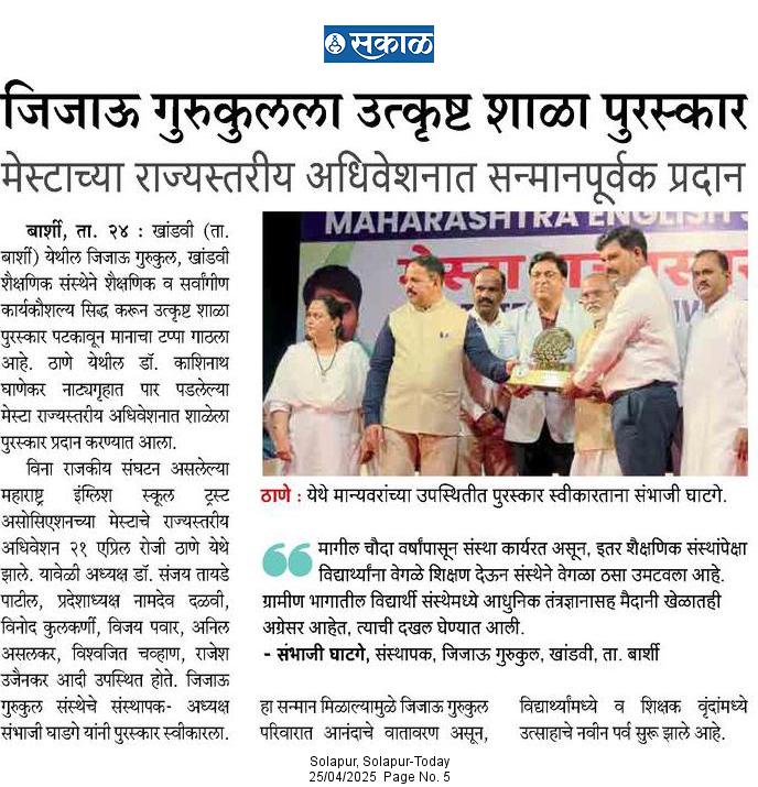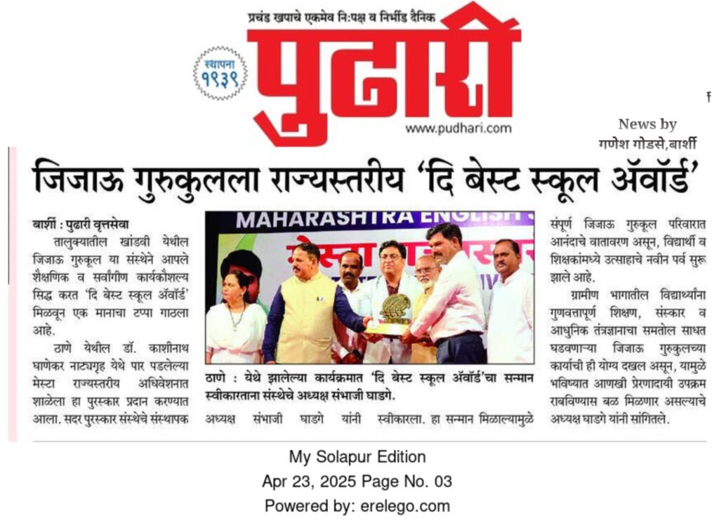 जिजाऊ गुरुकुल खांडवीला राज्यस्तरीय The Best School Award Uncategorized April 28, 2025April 28, 2025 jijaugurukul.inLeave a Comment on जिजाऊ गुरुकुल खांडवीला राज्यस्तरीय The Best School Award डॉ. काशिनाथ घाणेकर नाट्यगृह, ठाणे मुंबई येथे पार पडलेल्या मेस्टा राज्यस्तरीय अधिवेशनात सन्मान